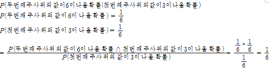 - 예를 들면 첫번째 주사위의 값이 3이 나왔을때 두번째 주사위의 값이 6이 나올 확률