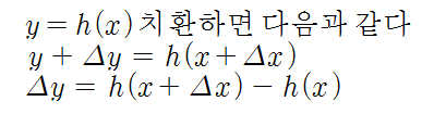 이 극한은 f'(x)에 해당합니다. 그러나 이 형태로는 바로 계산하기 어렵습니다.바로 계산하기 어렵기에 치환을 이용해야 합니다. 치환을 이용해서 y = h(x)로 두면 다음과 같습니다.