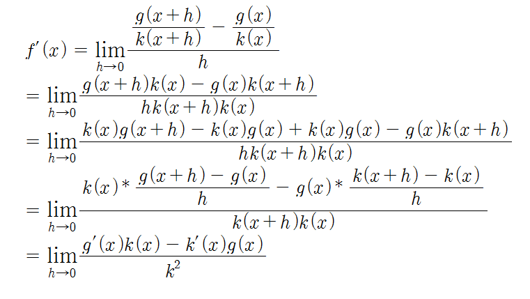 - = lim(h->0) [(k(x) * g(x+h)) - (k(x) * g(x)) + (k(x) * g(x)) - (g(x) * k(x+h)) / h * k(x+h) * k(x)]