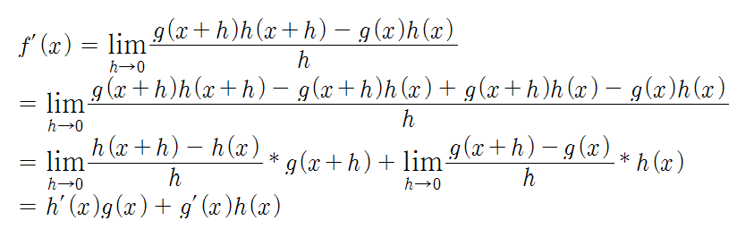 - = lim(h->0) [(g(x+h) * h(x+h)) - (h(x+h) * g(x)) + (h(x+h) * g(x)) - (g(x) * h(x))]/h
