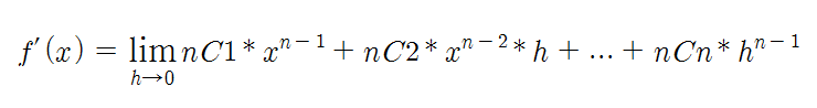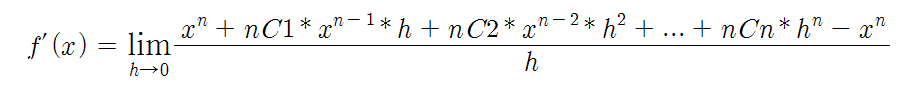 - f'(x) = lim(h->0) [(x^n + nC1 * x^(n-1) * h + nC2 * x^(n-2) * h^2 + ... + nCn * h^n - x^n)/h]