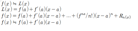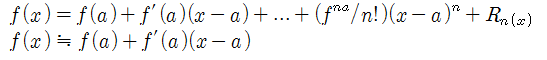- f(x) = f(a) + f'(a)(x - a) + ... + (f^(n)(a) / n!)(x - a)^n + R_n(x)