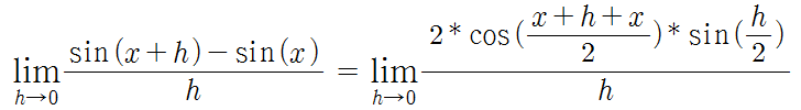 - lim(h->0) (sin(x + h) - sin(x))/h = lim(h->0) [2 * cos((2x + h) / 2) * sin(h / 2)]/h