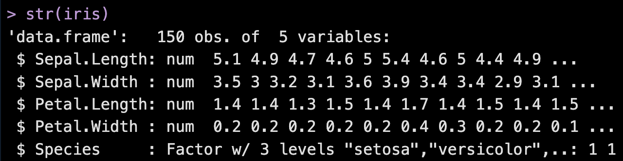 iris라는 데이터셋이고, 5열의 값이 Factor형으로 이루어져 나머지 4개의 열과 다른 타입의 값이라는것을 보실수 있습니다.