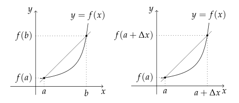 예를 들어, 함수 f(x)의 그래프가 x = a에서 x=a+델타x를 지난다고 가정해보자.